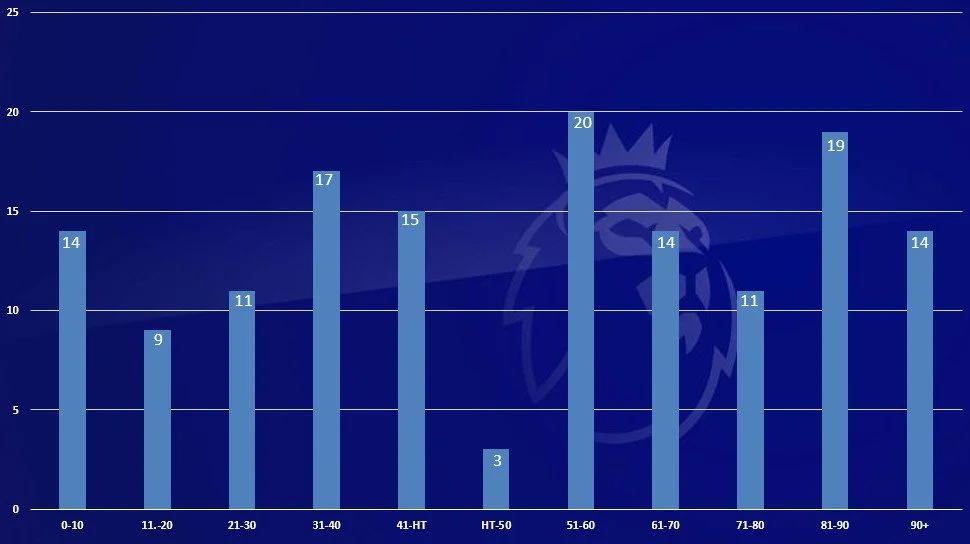 To begin, I analysed every successful corner to identify the minute in which goals were scored. The graph below breaks this down into 10-minute segments THROUGHOUT A MATCH.